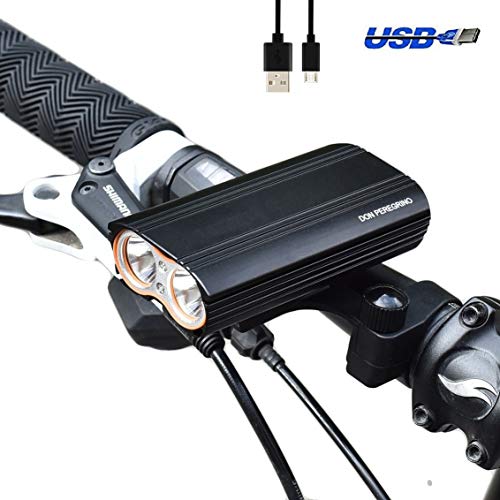 Todas las características de DON PEREGRINO LED Faro Delantero Bicicleta Gama Alta – Cuerpo de Aluminio – 2000 Lúmenes Super Bright – IPX 6 Waterproof – Batería de Litio 4400 mAh USB Recargable Luz de Emergencia al Aire Libre