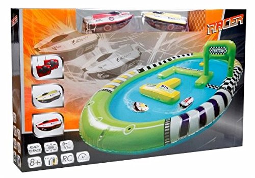 Juguetes Racer R/C Speed Barco, 2pieza 27/40MHz. incluye un barco de hinchable, los barcos que se puede llenar con agua y allí que navegan Speed barcos. Speed tienen una frecuencia de 27/40 MHz Distancia máxima de 15 m.Velocidad de hasta 3 km/h. incluye 1 x AAA para cada barco. y 4 x pilas AA para cada mando a distancia Dimensiones barcos: 11 x 5 x 4 cm. tamaño aufgeblasenes Barco: 125 x 94 x 12 cm, para niños a partir de 5 años.